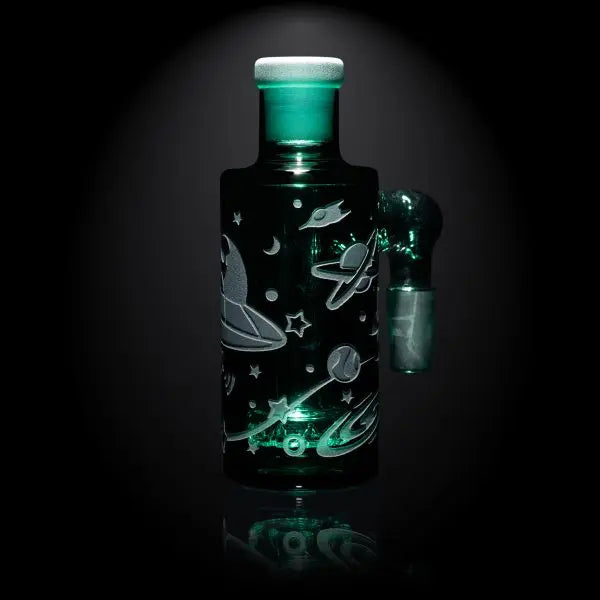 This 5” wet glass ash catcher is part of the Space Odyssey collection. Join us as we venture deep into the cosmos on a voyage in search of aliens and strange planets. It contains a showerhead perc and an extra water chamber that works beautifully to filter smoke/vapor and keep your piece clean. It seamlessly combines with any of our Milky Way pieces to complete your bong setup. It comes available in 45 degree or 90 degree options.