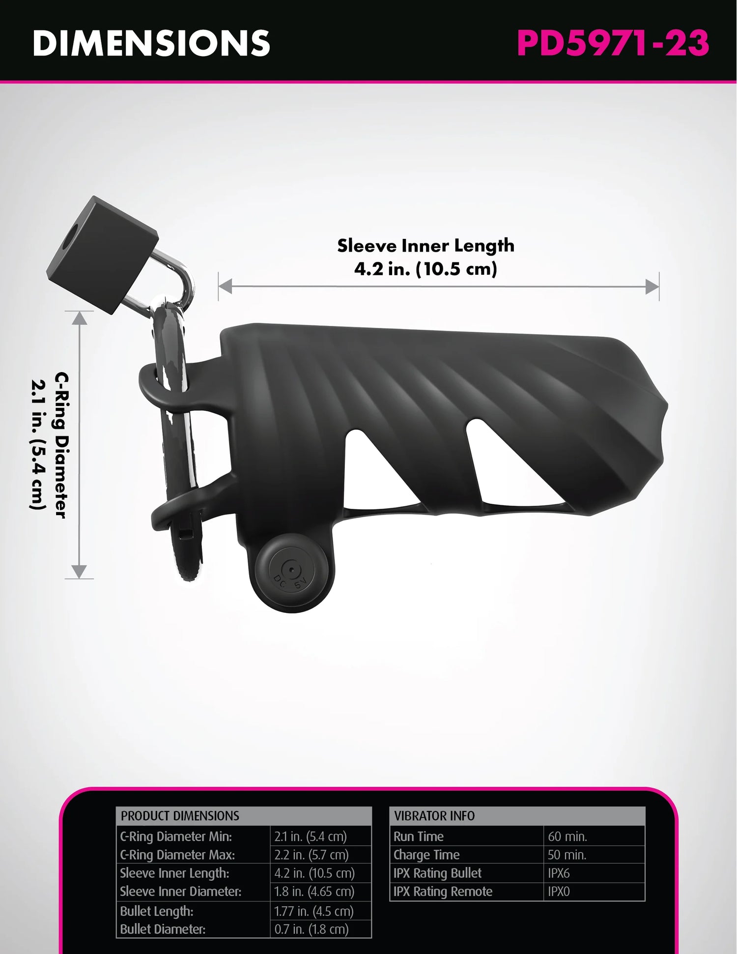 • C-Ring Diameter Min.: 2.1 in. (5.4 cm) • C-Ring Diameter Max: 2.2 in. (5.7 cm) • Sleeve Inner Length: 4.2 in. (10.5 cm) • Sleeve Inner Diameter: 1.8 in. (4.7 cm) • Plug Length: 3.5 in. (8.8 cm) • Insertable Length: 3.0 in. (7.6 cm) • Insertable Width: 1.1 in. (2.7 cm) • Bullet Length: 1.8 in. (4.5 cm) • Bullet Diameter: 0.7 in. (1.8 cm)