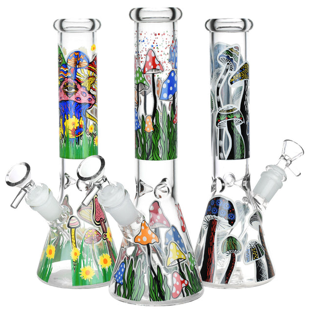The Shrooms Are Watching Glow Glass Beaker Water Pipe features a beaker style pipe body with a slitted downstem diffuser and a funnel style herb slide with a handle. These durable borosilicate glass water pipes are decorated with fully wrapped decals depicting beautiful, cosmic, and gnarly mushrooms, and they also have a 3 pinch ice catcher for rapidly cooling smoke. Measures 10 inches (25.4cm) tall. Designs vary.