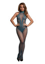 Bodystocking with a combination of lace-pattern and fishnet. This style has a halter neck and open crotch. This bodystocking has a lot of stretch and can be worn from size XS to XL.