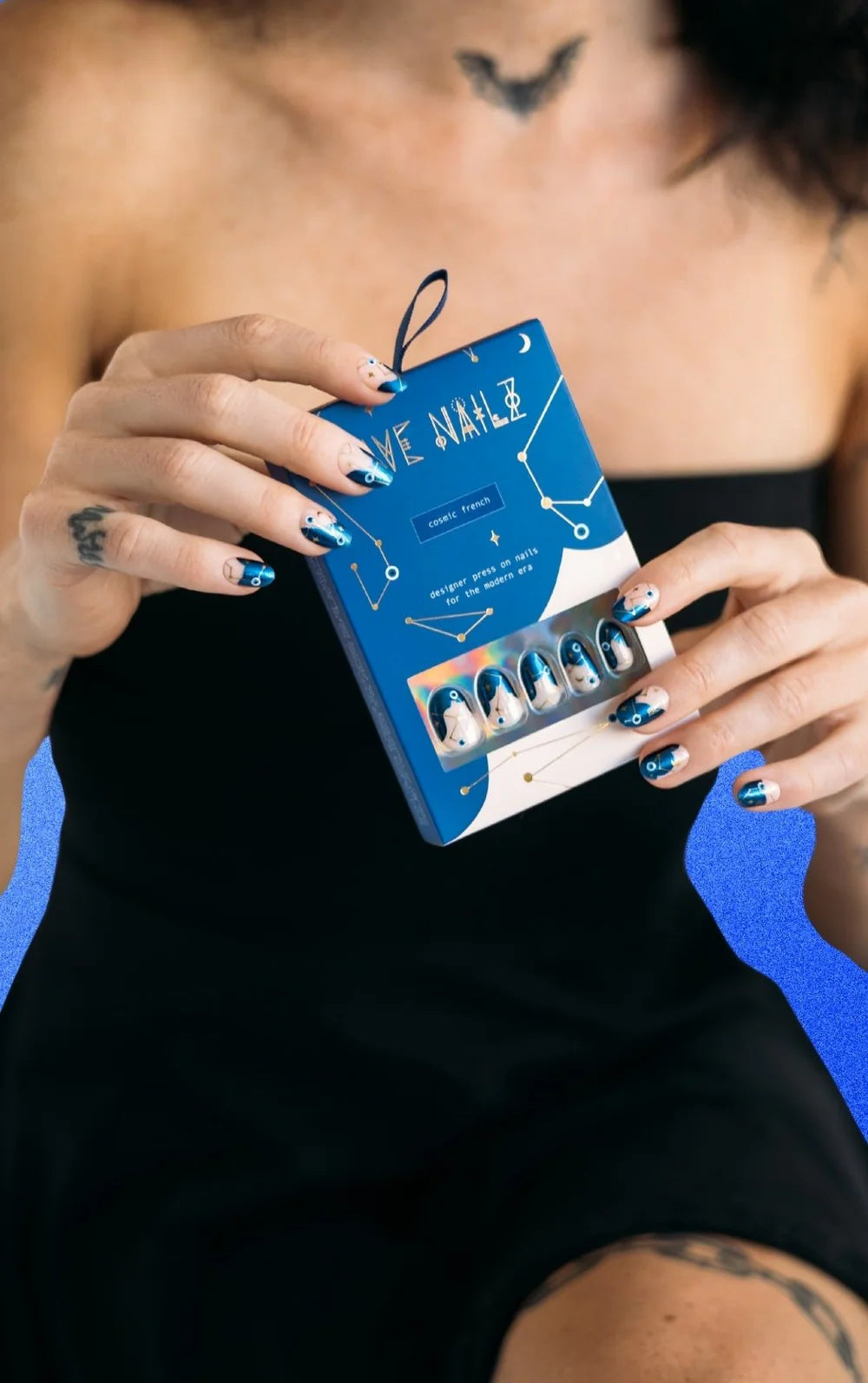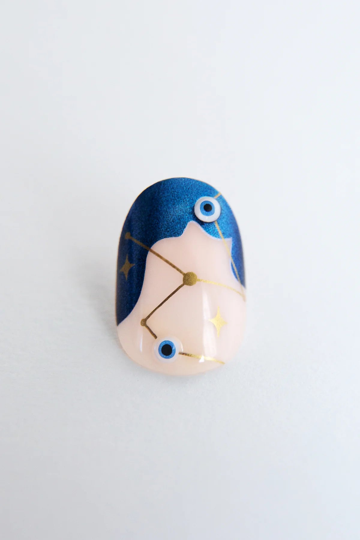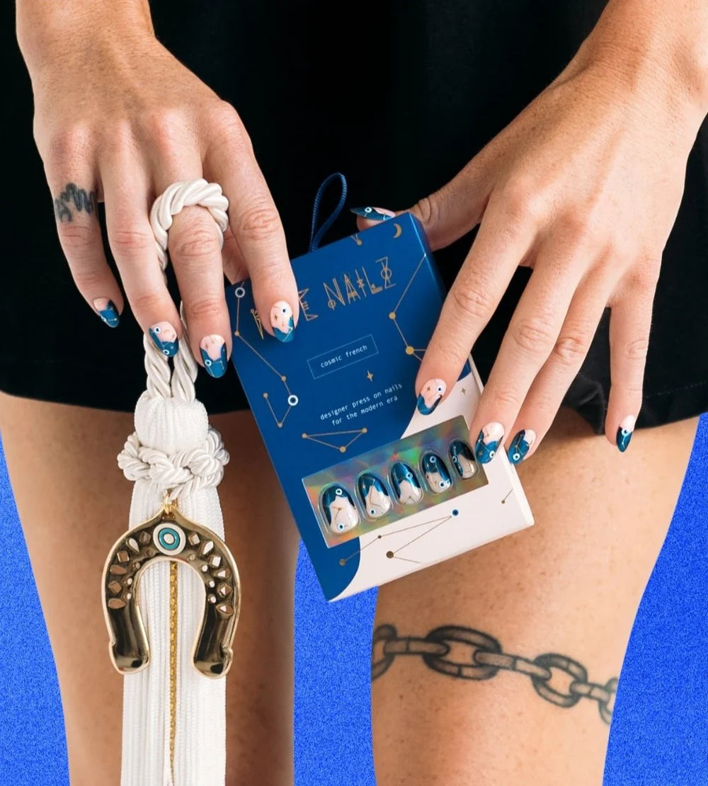 Protection never looked so good. This short oval set features a semi-sheer nude base that flatters every skin tone, finished with shimmering blue tips, gold foil, and glossy 3D evil eyes that mimic the look of hand-painted nail art. Designed with a natural curve that hugs your nail for a seamless fit and finished with a chip-resistant topcoat for two+ weeks of wear. Manifest the magic—every time you move your hands.