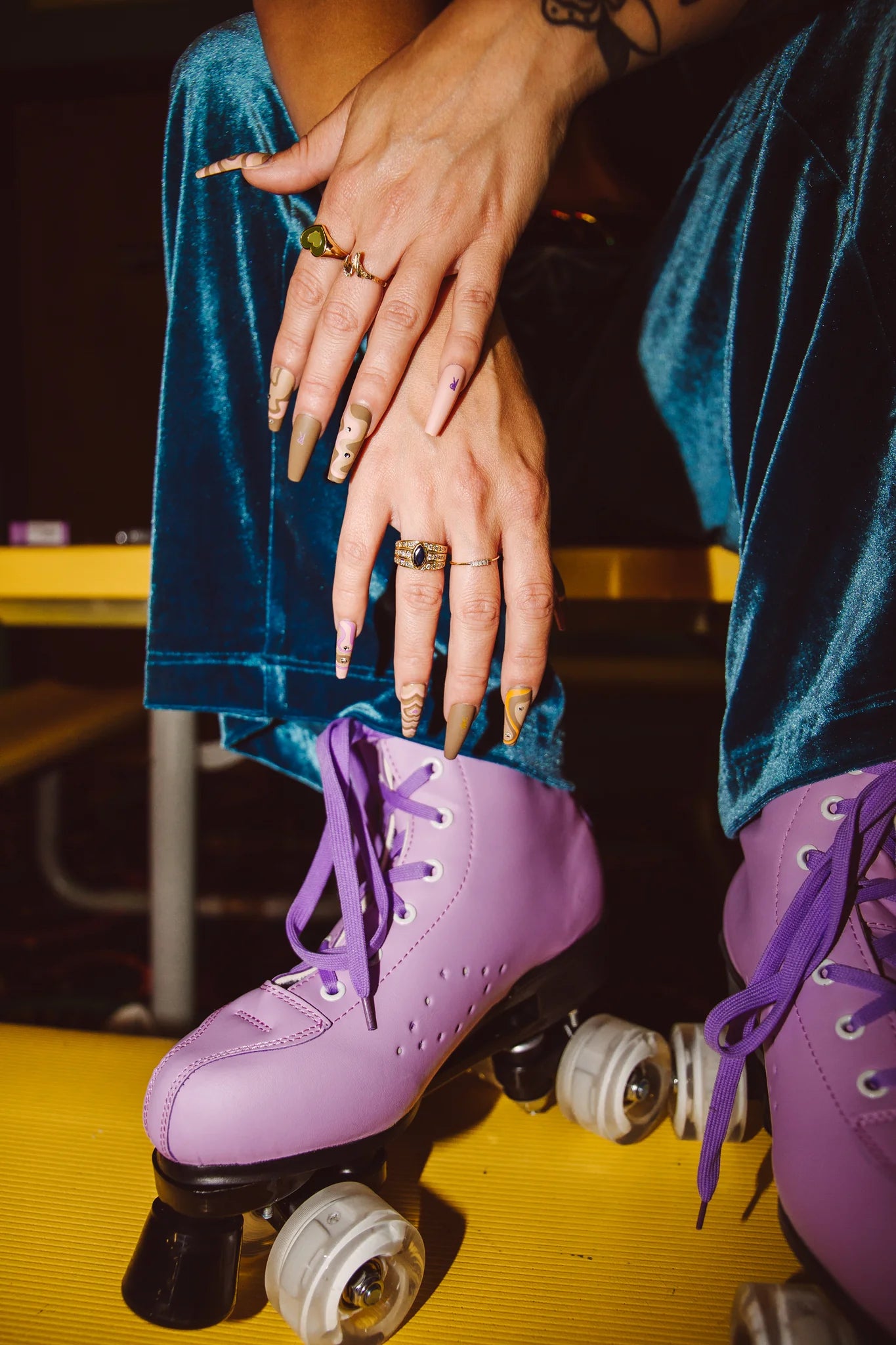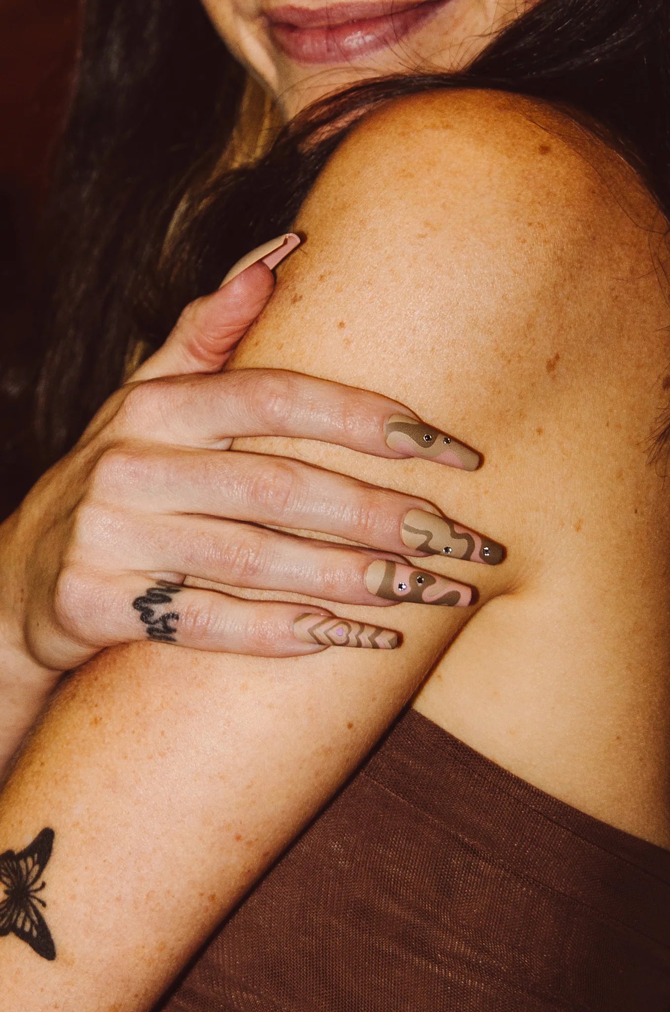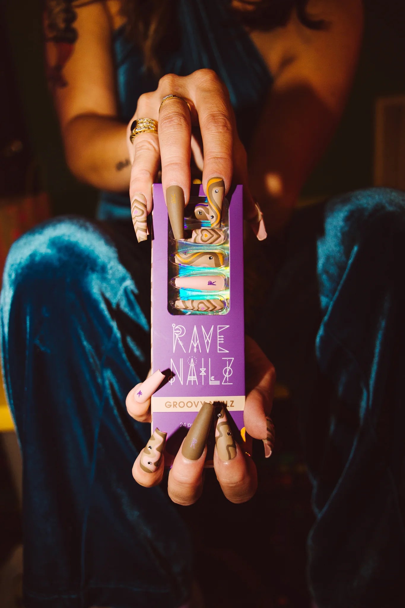 The Groovy Nailz are an ultra long coffin nail- our first of this shape! All 24 nails have a unique design, featuring groovy swirls, Powerpuff Girl reminiscent hearts, and shades of brown and pastel pinks, oranges, and purples. Tiny crystals are secured onto many of the nails. These bejeweled, 70s nails are show-stoppers.
