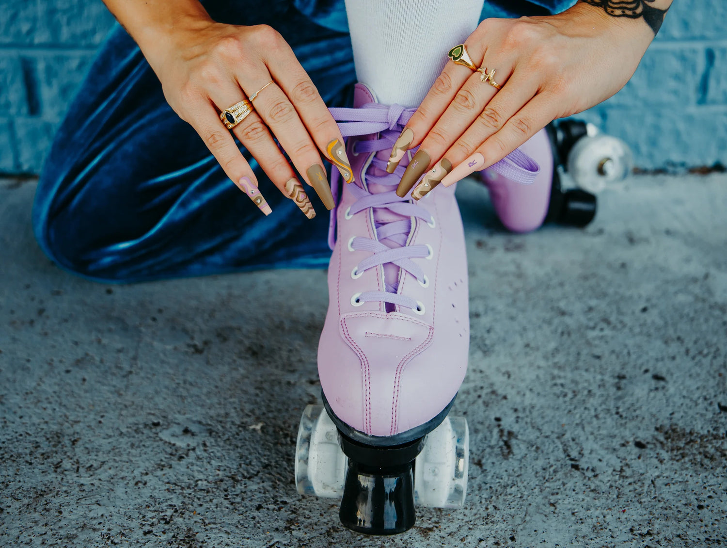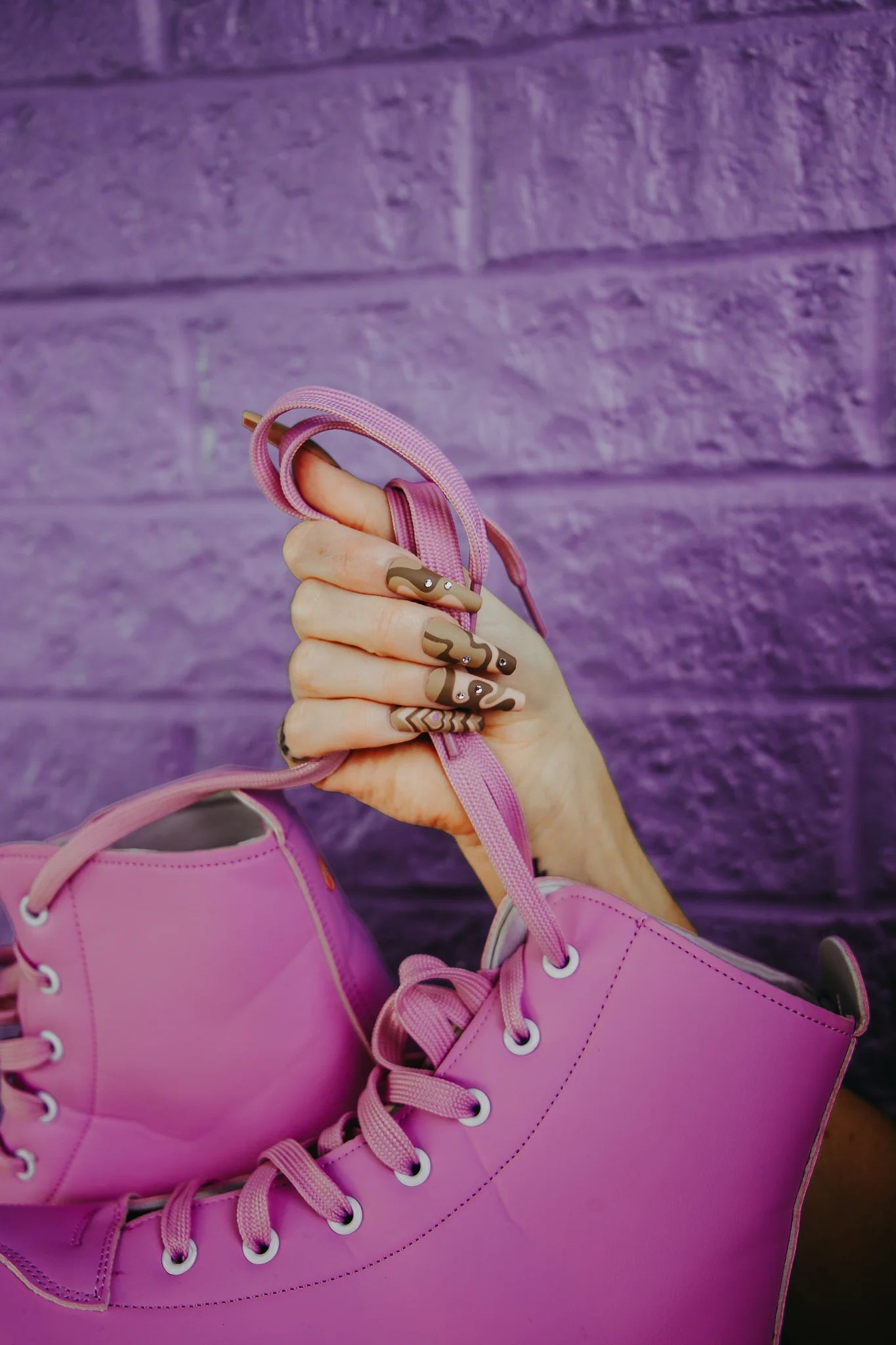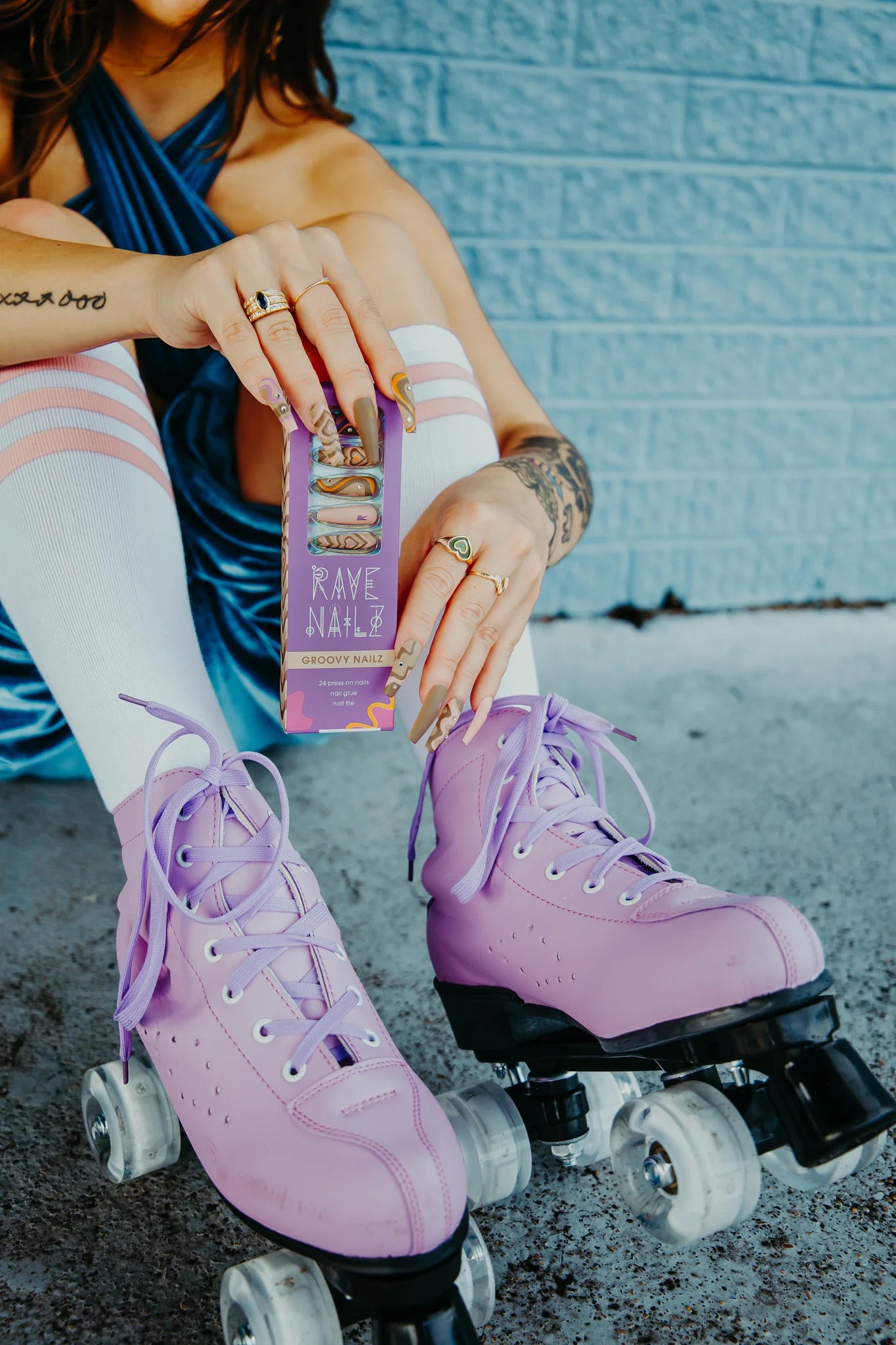 The Groovy Nailz are an ultra long coffin nail- our first of this shape! All 24 nails have a unique design, featuring groovy swirls, Powerpuff Girl reminiscent hearts, and shades of brown and pastel pinks, oranges, and purples. Tiny crystals are secured onto many of the nails. These bejeweled, 70s nails are show-stoppers.