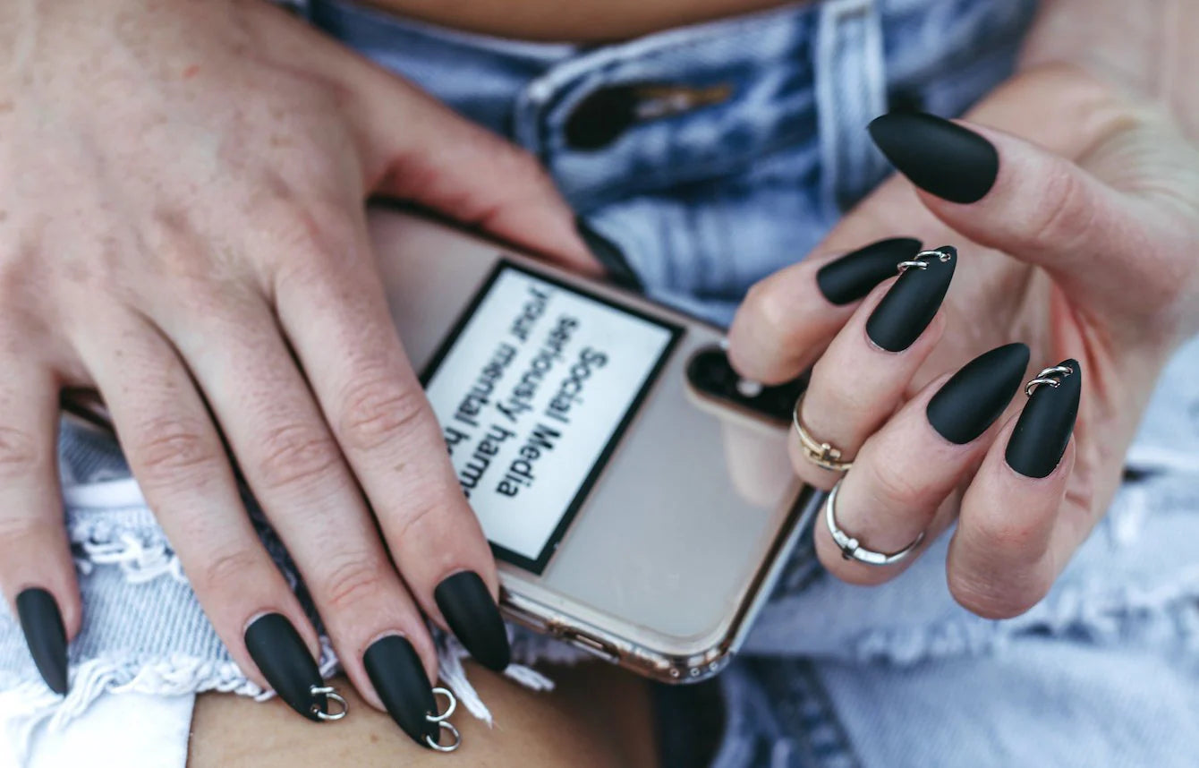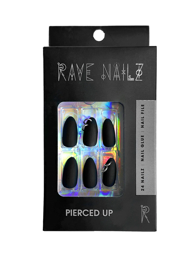 The Pierced Up Nailz are matte black press on nails. These stiletto nails include 4 accent nails that are pierced with silver hoops. These long-lasting nails are sure to impress.