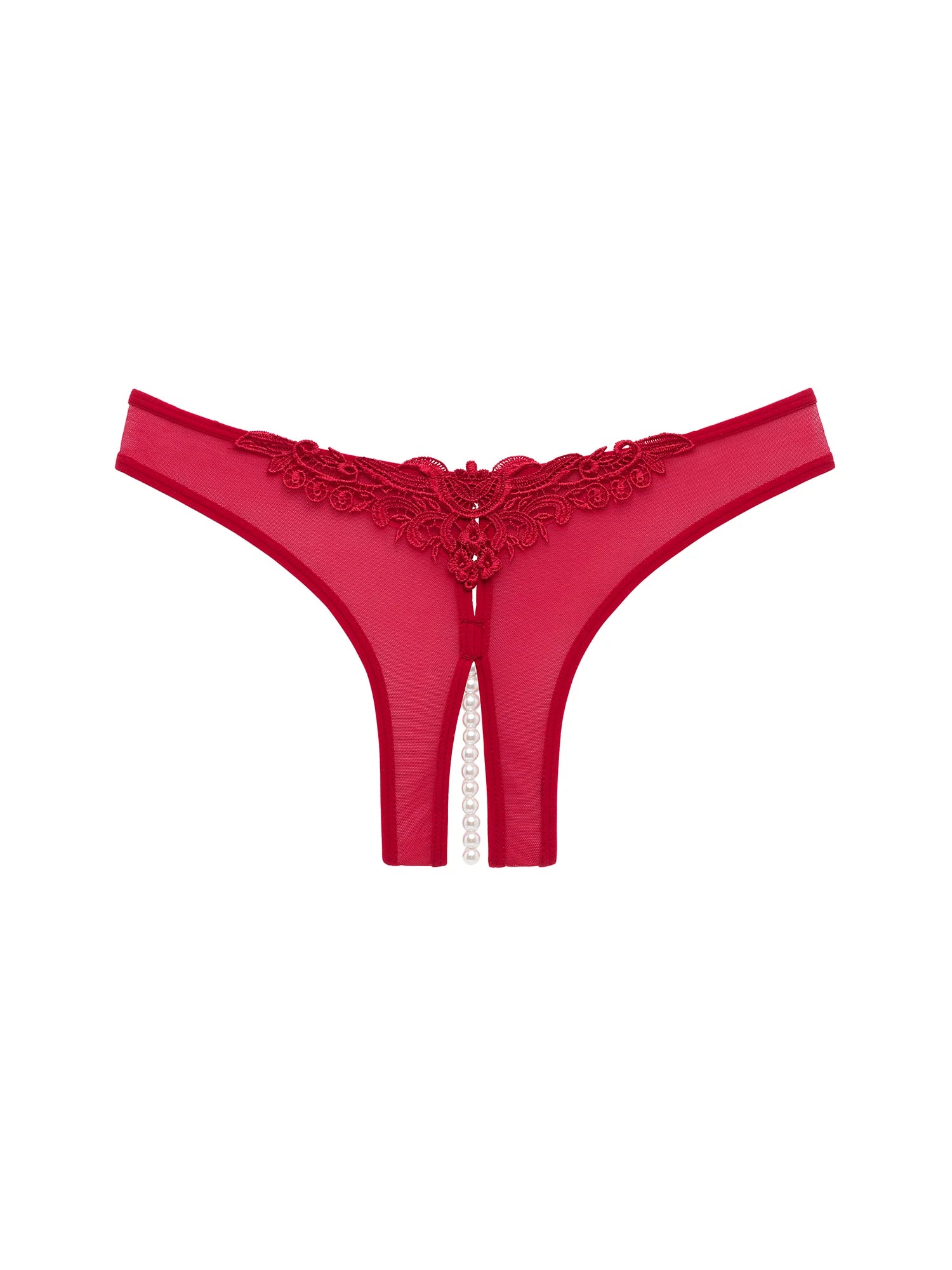 Step into elegance with our pleasure-inducing Paradise crotchless pearl thong that blends luxury with playful charm. Crafted from soft mesh with Venise lace appliqué, this pearl underwear teases in all the right places with a delicate string of pearls along the crotchless panty opening. Our pearl lingerie is ideal for bridal occasions & plus-sized beauties as it provides the perfect touch of allure. Available in a wide variety of colors, this pearl string panty will become your favorite sexy secret that you can pair with a camisole or teddy for a smoldering look. Slip on these crotchless pearl panties to enjoy hidden waves of pleasure that only you can feel—Your secret is safe with us.