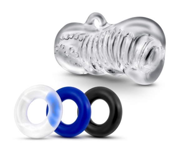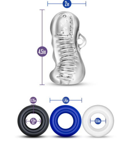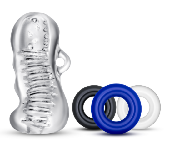 Enhance your enjoyment with the Quickie Kit - Jerk Off. Use the three cock rings to create extra pressure and increase stamina as you stroke your shaft with the sensuously soft sleeve. The ribbed inner channel of this bestselling, clear stroker heightens sensation during solo play—or have your lover watch you glide in and out. Made of lab-tested body safe materials, this Quckie Kit plays with ease when you use your favorite quality water-based lubricant.