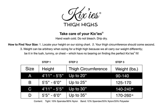 Sizing: Measure by height first and thigh circumference second. Weight can be arbitrary when sizing for a thigh-high. We all carry our weight differently; be it in the tush, tummy or thighs – which have no bearing on finding the perfect Kix’ies® fit! Time to kick those binding tights and outdated hosiery to the curb!