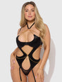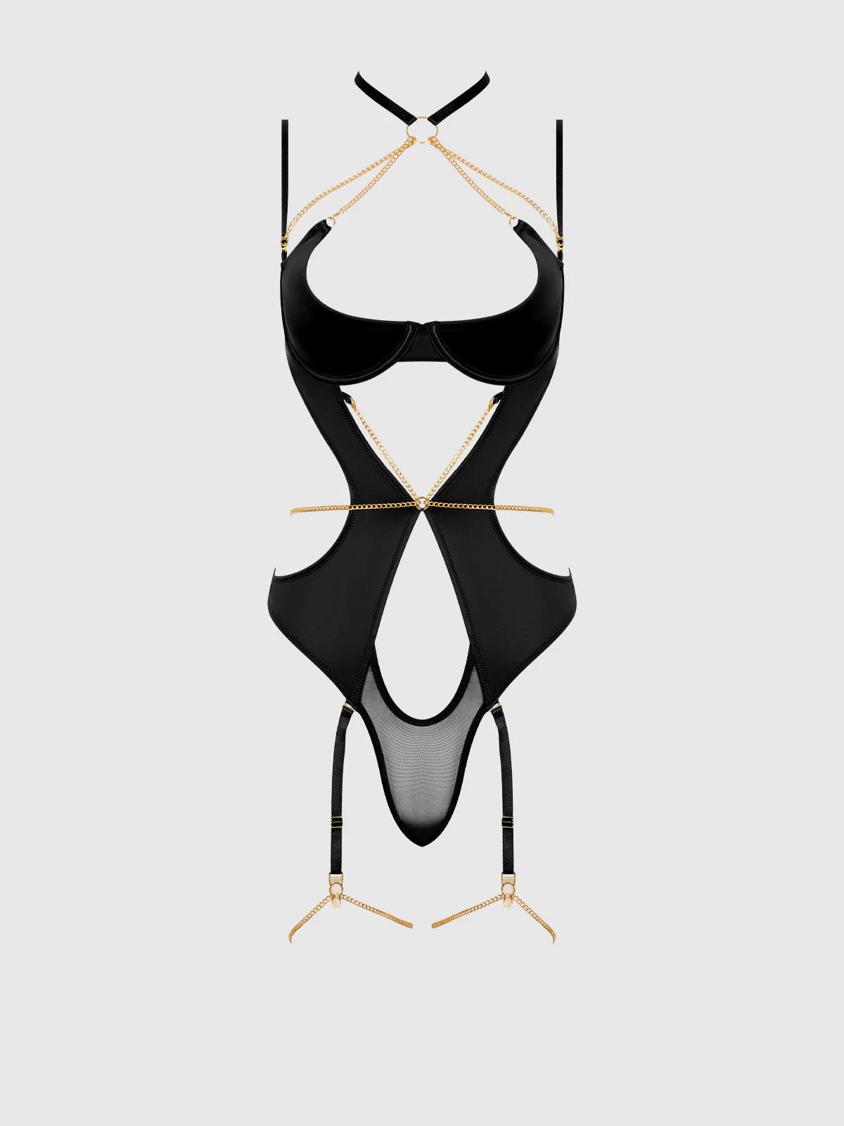A dangerously sexy one piece, the Evangeline Satin & Chain Halter Teddy elevates the allure with its dreamy fabric and luxe accents. Sleek liquid satin and mesh envelops your figure while gilded chains wrap across the skin, highlighting the bust, waist, and thighs. Adjustable chains customize to your body for a fit that flatters every figure.