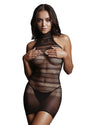 High neck mini dress with lace-pattern border and striped pattern. This dress has some stretch and can be worn from size S to L.
