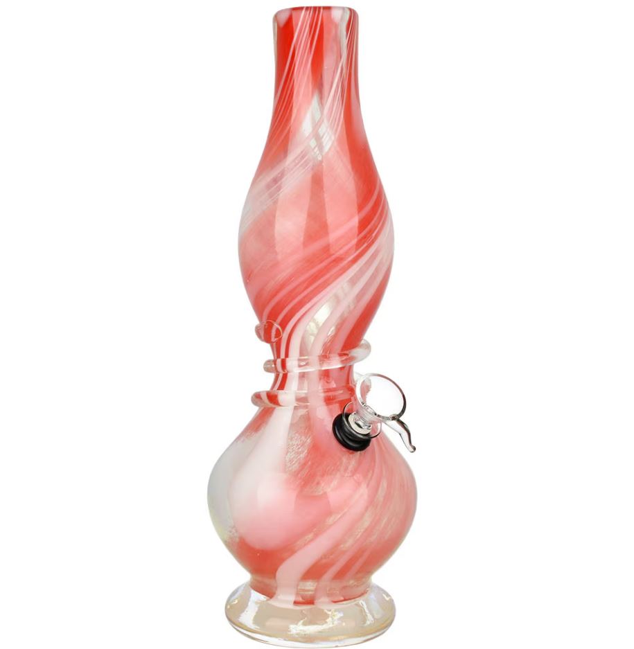 These Developing Dreams Soft Glass Water Pipes are crafted with malleable soft glass into elegant shapes with vivd coloring. The pipes have an hourglass vase shape with a twisted color design and a decorative glass coil around the neck. These water pipes stand 12.25 inches (31.1cm) tall, and each pipe includes a grommet style herb slide connection and downstem. Colors vary.