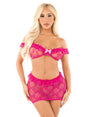 Embrace your flirty side in this playful 2 piece ruffle trimmed bralette and skirt set by Leg Avenue. Featuring a bow net bra top and V-cut low waist mini skirt, this hot lingerie set is sure to spice things up in the bedroom.