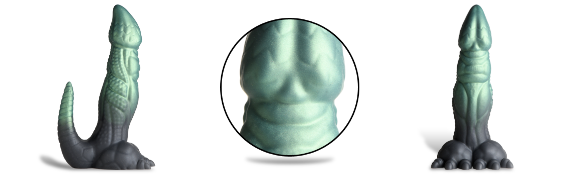 With beautiful, glittering blues, blacks, purples and teals, this Dino dong is about to outshine your other toys! With a massive, mushroom-tip head, you'll enjoy every time you pop it inside! The curved shaft has prominent veins on one side and a smooth ridge on the other. At the base are little dinosaur legs, a curved tail and a small pair of balls. It's as fun to look at as it is to ride! The wide base provides powerful suction so you can go hands-free by placing it on any flat surface to keep it in place. You can also combine it with a compatible strap-on harness for pegging play! Made out of premium, phthalate-free silicone, it has a firm core and soft, silky surface. Explore every sci-fi, fantasy, roleplay or cosplay scene you want with this epic adult toy! Use only with water-based lubricants for best results. After play is over, wash the dildo with warm water and soap and use a toy cleaner to spray clean. Wipe dry and store in a cool, dark place out of direct sunlight.