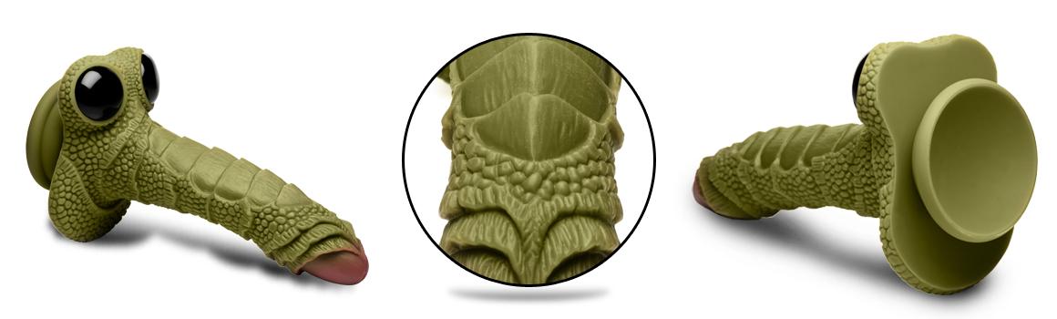 Dive deep into new fantasies with this Swamp Monster dildo from Creature Cocks! Its mysterious shaft is textured with tiny bumps and scaly ridges. The long shaft has a gentle curve to it for your penetrative pleasure and a soft pink head that blossoms like a bud at the end of a green stem. At the base is a wide, flat plateau that you can ride and two, shiny, black glass orbs that seem to stare up into your depths as you ride it! Is it face or phallus? That's up to you to decide as you enjoy the sweet and silky smoothness of premium silicone as you plunge it deeper into your own wet and mossy swamplands. Completely phthalate-free, it is body-safe to use with water-based lubricants. The base is also compatible with a strapon harness for those of you who want to share in the fantasy and get pegged! Or ride solo; the strong, suction cup base lets you enjoy it hands-free! After play is over, wash the dildo with warm water and soap and use a toy cleaner to spray clean. Wipe dry and store in a cool, dark place out of direct sunlight.