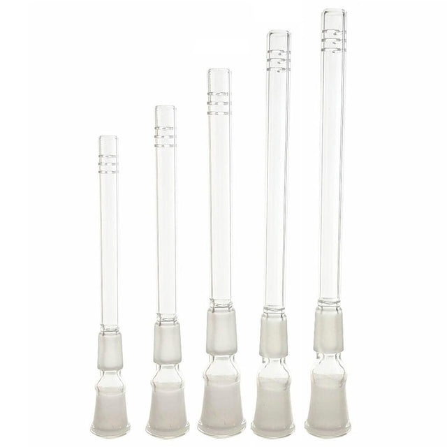 These clear downstems feature slits and connect your bowl and/or banger to your water pipe and/or dab rig. They are very easy to use and clean due to their simplistic design. They have an outer joint diameter of 14mm and will support 14mm bowls. These downstems are available in multiple lengths.