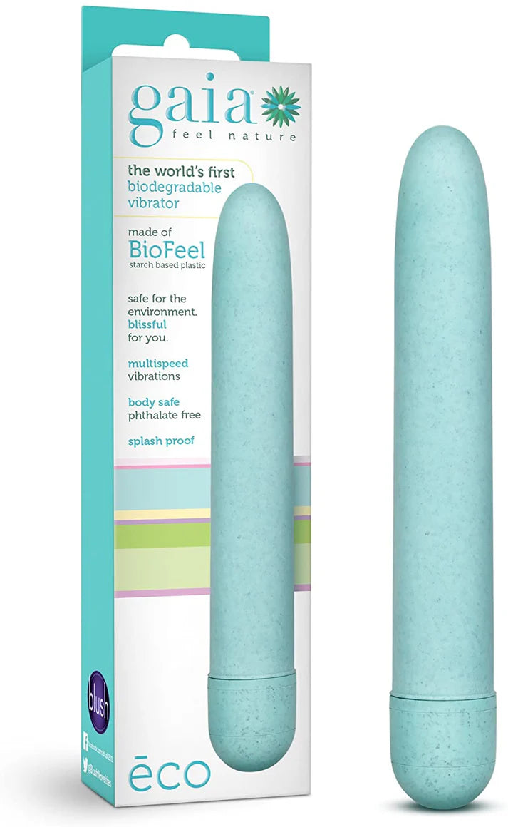 The Gaia Eco is the world's first biodegradable and recyclable vibrator. ECO is made from biofeel - a starch-based bioplastic. Take comfort in knowing that Eco uses less energy creating less greenhouse gas emissions than any other sex toy on the market. The design is classic and can be used for internal or external stimulation of the Eco: including a slim profile and tapered tip for added comfort. With silent multi-speed vibrations controlled by the twist of a dial, it's easy to find your perfect feel. This toy is safe for the body and easy to clean. "" The world's first environmentally friendly biodegradable and recyclable vibrator. " Versatile - this design classic can be used for internal or external stimulation. "Comfort 'end of 2.5cm Width with a tapered tip, for added comfort." Feeding - Deep hungry vibrations. Multiple adjustable speed settings easily controlled by a twist of the dial ". Made from body safe material and meets or exceeds international safety standards set by CE and RoHS guidelines. Phthalate and latex free. It's your body be aware of what you put in it.Length: 7 inchesinsertable Length: 5.75 incheswidth: 2.5 cm