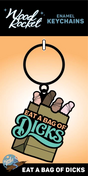 This funny enamel keychain by Wood Rocket is the perfect novelty accessory for your pocket. This Eat A Bag of Dicks Keychain is just the right amount of dirty to wear in public. Hang it on your key ring or give it as a gift!