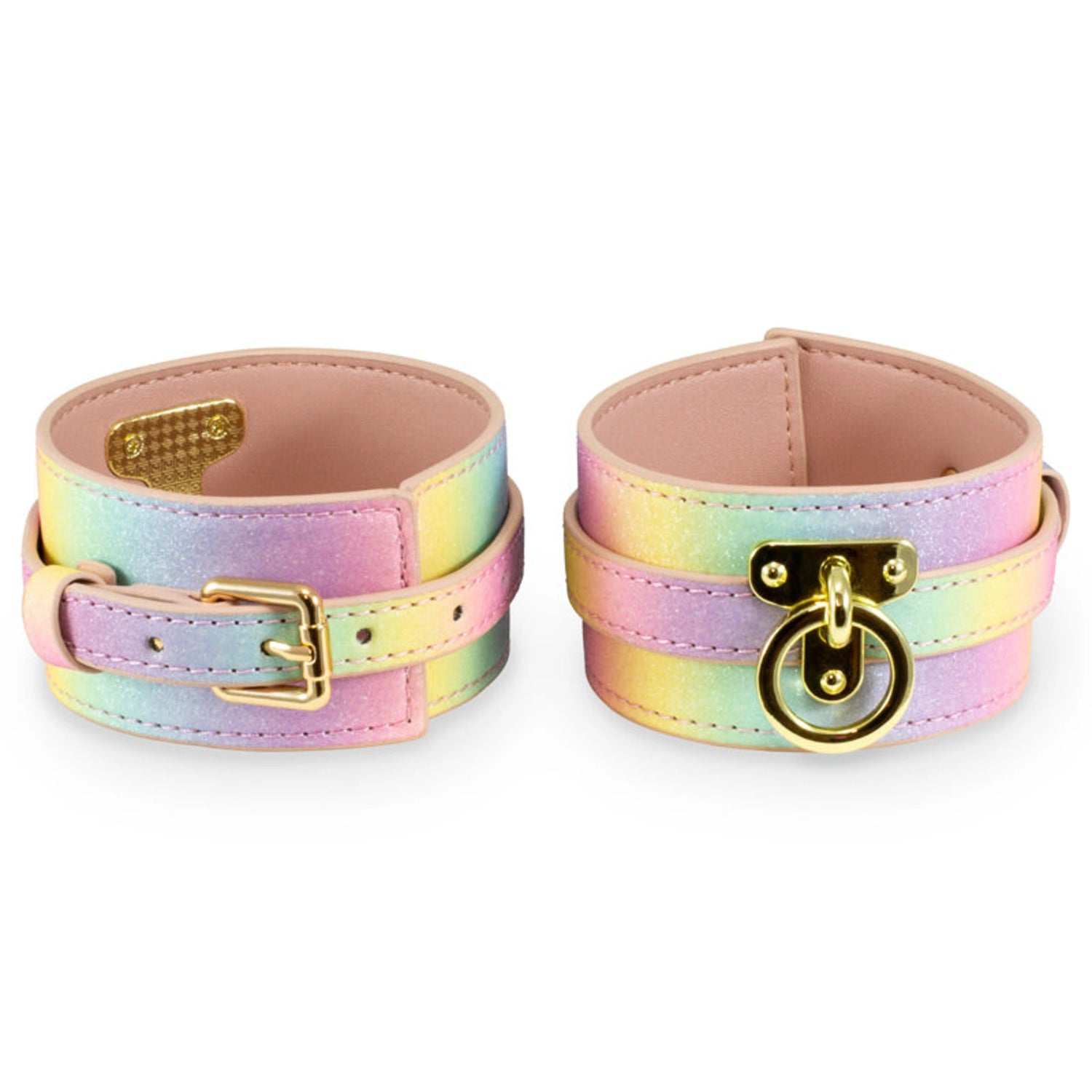 Keep your cutie all tied up with an adorable pastel rainbow hogtie with lush gold accents. Bind the wrists and ankles behind or in front using four thick, durable cuffs meant for hardcore restraint-play. The universal connector is compatible with most handcuffs. Your sub never looked so good!