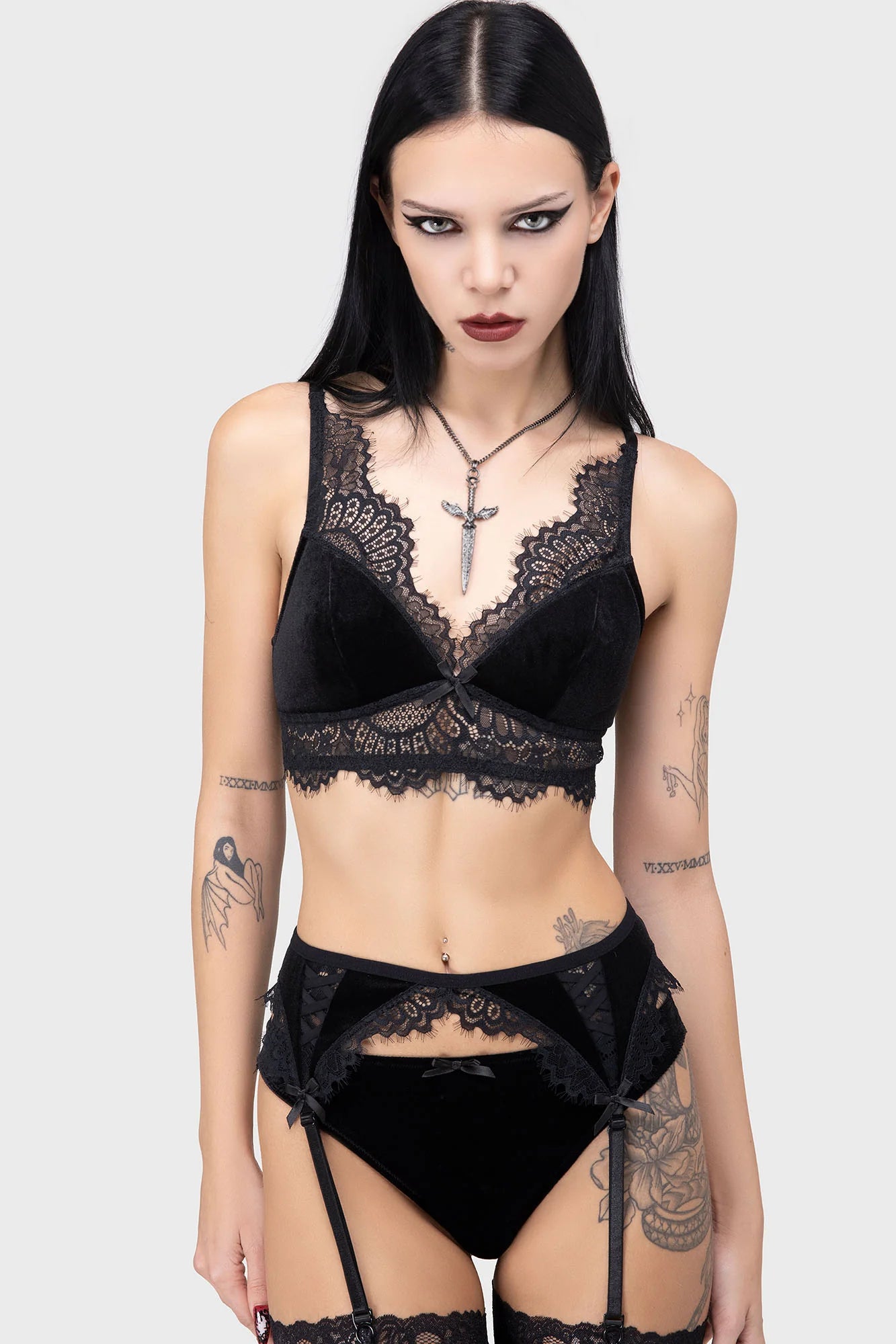 - Stretch lace with velvet panels.