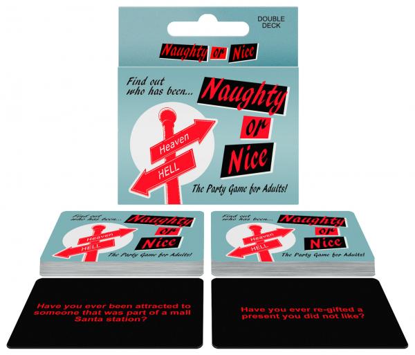 Players take turns drawing and reading cards. After each question is read, anybody who answers “YES” is naughty, and anyone who answers “NO” is nice. Naughty players take a drink! Game Includes: 107 cards and 1 rule card.