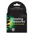 Hold up to light for 30 seconds for glow-in-the-dark condom fun! All ONE® Condoms feature Sensatex® ultra-soft latex for a more natural pleasure feeling, and are vegan-friendly, non-GMO, and made with natural rubber latex. ONE® Glowing Pleasures™ would approximately be MyONE® FitCode 53H.
