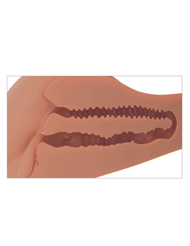 Please note: both holes connect to the same internal canal, which is approximately 10 inches long. The walls of the tunnel are intended to be tight and stretchy and are not very wide when you first start out. With a few uses, the elasticity will increase and should be able to accommodate most size penis.