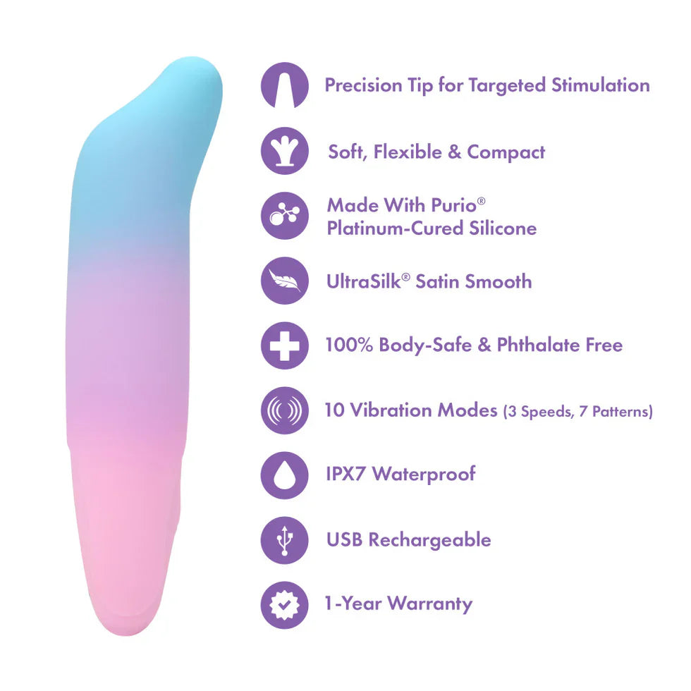 Surrender to gentle yet powerful waves of pleasure with Dolphin Kisses, a petite powerhouse that turns every touch into sensual indulgence. Designed for playful pleasure, this adorable, pocket-sized vibrator reveals 10 deep yet quiet vibration modes, with a precision tip for targeted sensations, guiding you to moments of pure bliss. Whether it’s slow, seductive foreplay, pinpoint clitoral stimulation, or sensual nipple pleasure, Dolphin Kisses delivers focused vibrations exactly where you crave them most. Explore a range of sensations, from gentle pulses to deep, resonant thrills, to discover your ultimate pleasure points. Crafted from Blush’s Purio® platinum-cured liquid silicone, the vibrator’s lusciously soft and bendable design ensures sweet and customizable pleasure. Its IPX7 waterproof rating ensures adventurous play, and USB charging adds convenience. Feel the playful caress of Dolphin Kisses and let every touch carry you away on a 'sea of intimate sensation'.