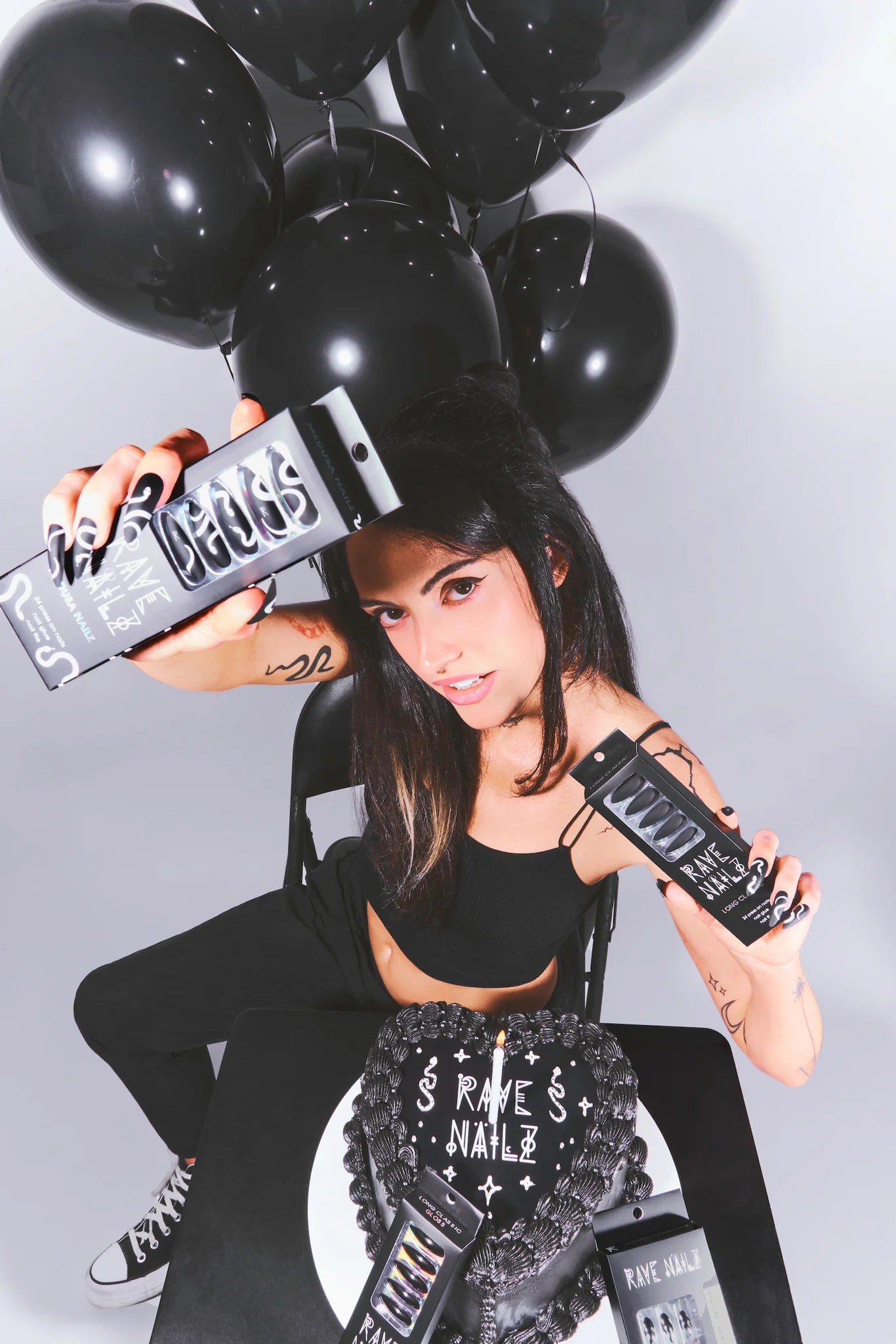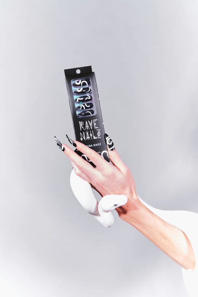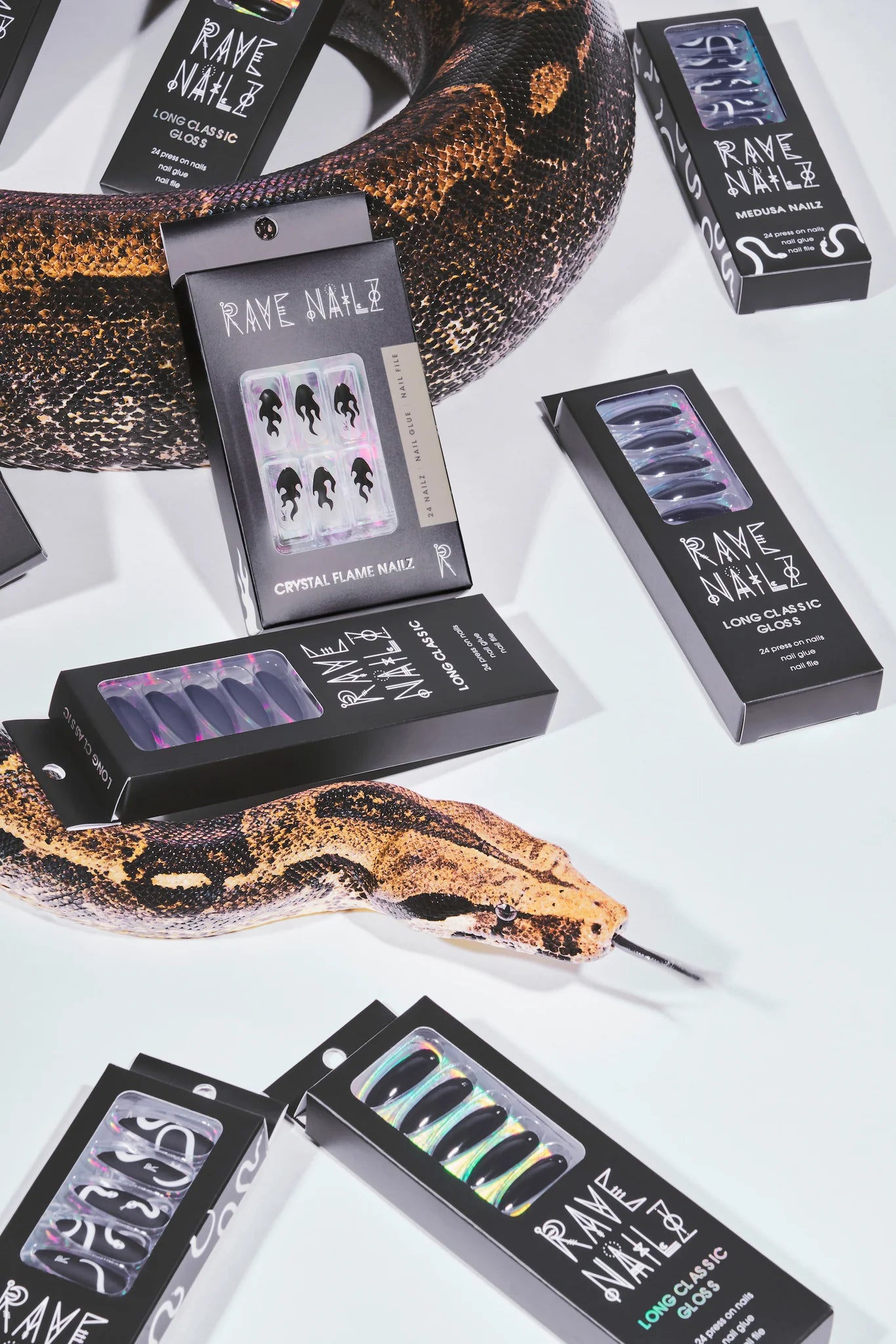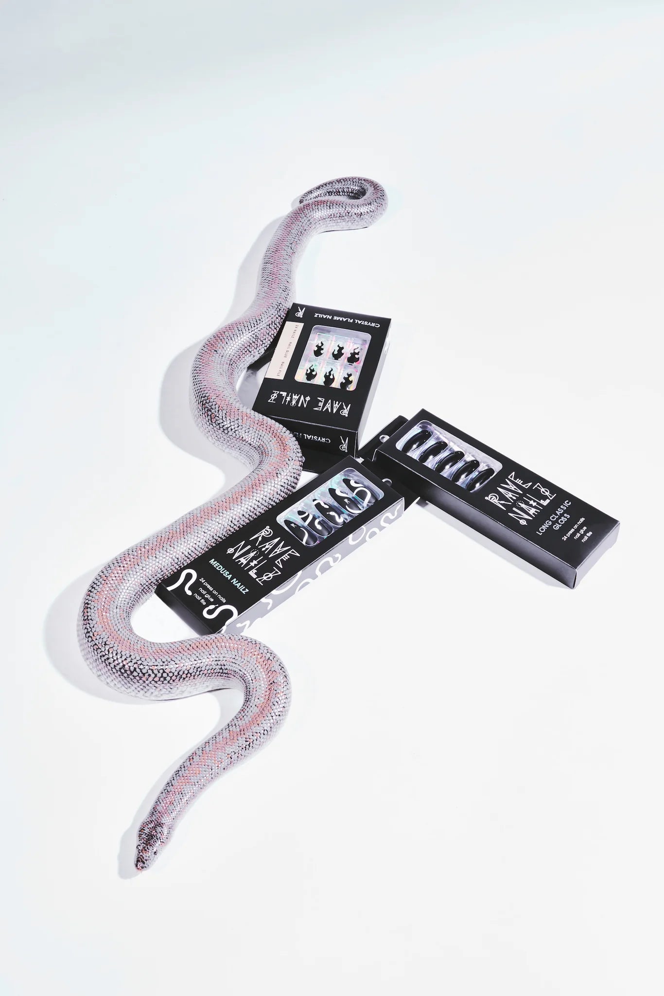 The Medusa Nailz are extra long black press on nails with a different snake on all 24 nails. A matte finish gives makes these nails extra witchy.