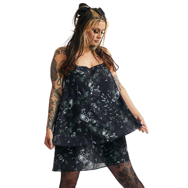 The new Garden Witch Trapeze dress is a silhouette you’re destined to fall in love with! This floaty chiffon dress features artwork created exclusively for Sourpuss by Villy Villain, and has skulls, mushrooms, insects – everything a garden witch could want! This flowy dress also has adjustable straps that criss-cross in the back for an easy fit – it looks perfect on its own or paired with your favorite cardigan or sweater.