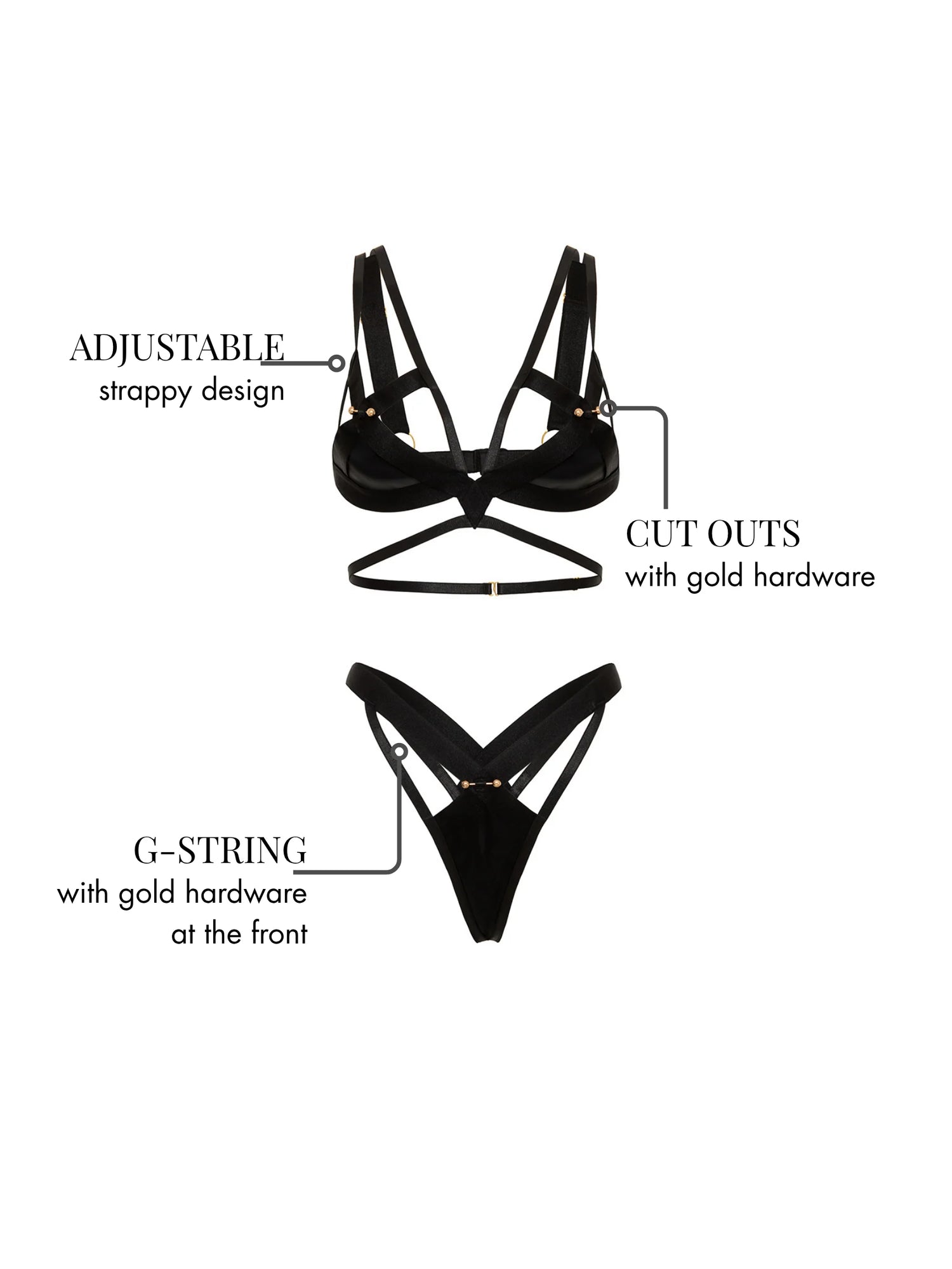 Unleash your inner risk-taker with the Fetish "X" Marks The Spot Bra Set. This daring set features gold hardware, wide straps for support, and an adjustable cage strappy design. The cut-out G-string with hardware detail completes the look. Take charge and make a statement.